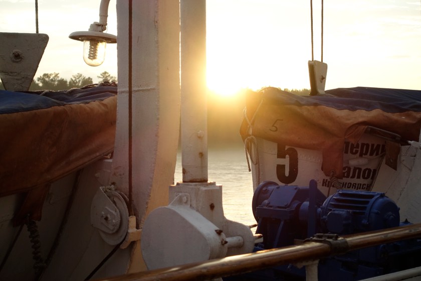 Am nächsten Tag geht es mit dem Schiff weiter nach Krasnorjask, Metropole in Sibirien, Namensgeberin einer ganzen Zeitzone und – nun ja – Geburtsort von Helene Fischer. Es trennen mich allerdings noch 1,5 Tage von der Stadt, die ich auf der MS Tschkalow verbringe. Das Schiff ist echte deutsche Wertarbeit, denn es wurde 1953 in Wismar gebaut und dann – gewissermaßen als Reparationszahlung – an die Sowjetunion übergeben. Heute bringt es Pakete und Menschen zu ihren Bestimmungsorten entlang des Enisey.