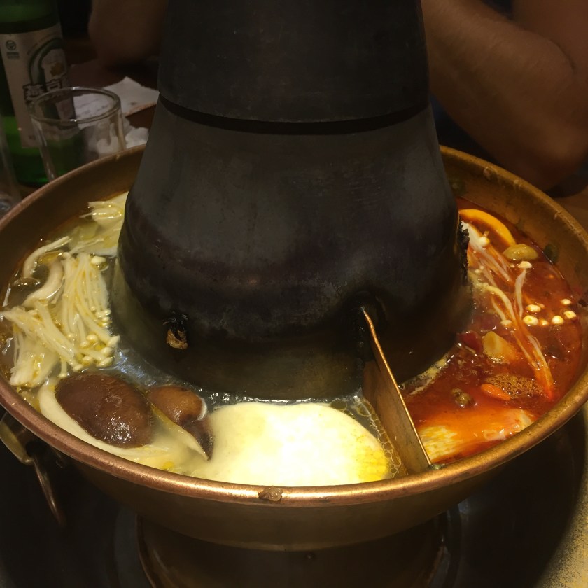Es wird ein Kupfertopf mit einem Kohlekamin in der Mitte serviert. Zur Hälfte mit kochender Gemüsebrühe, zur anderen Hälfte mit Chili-Brühe gefüllt. Zum Glück existiert im Restaurant ein DIN-A4 Zettel mit wunderlichen Übersetzungen, der uns immerhin davor bewahrt, für Europäer völlig ungenießbare Dinge zu bestellen. Alle Zutaten bestellt man roh und kocht sie dann in der Brühe.