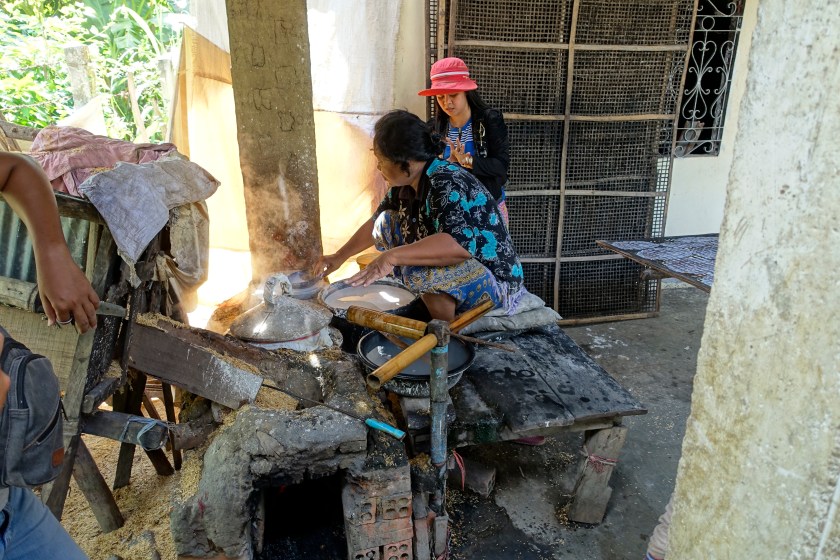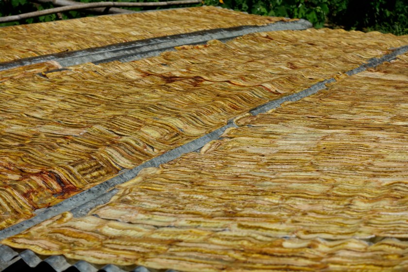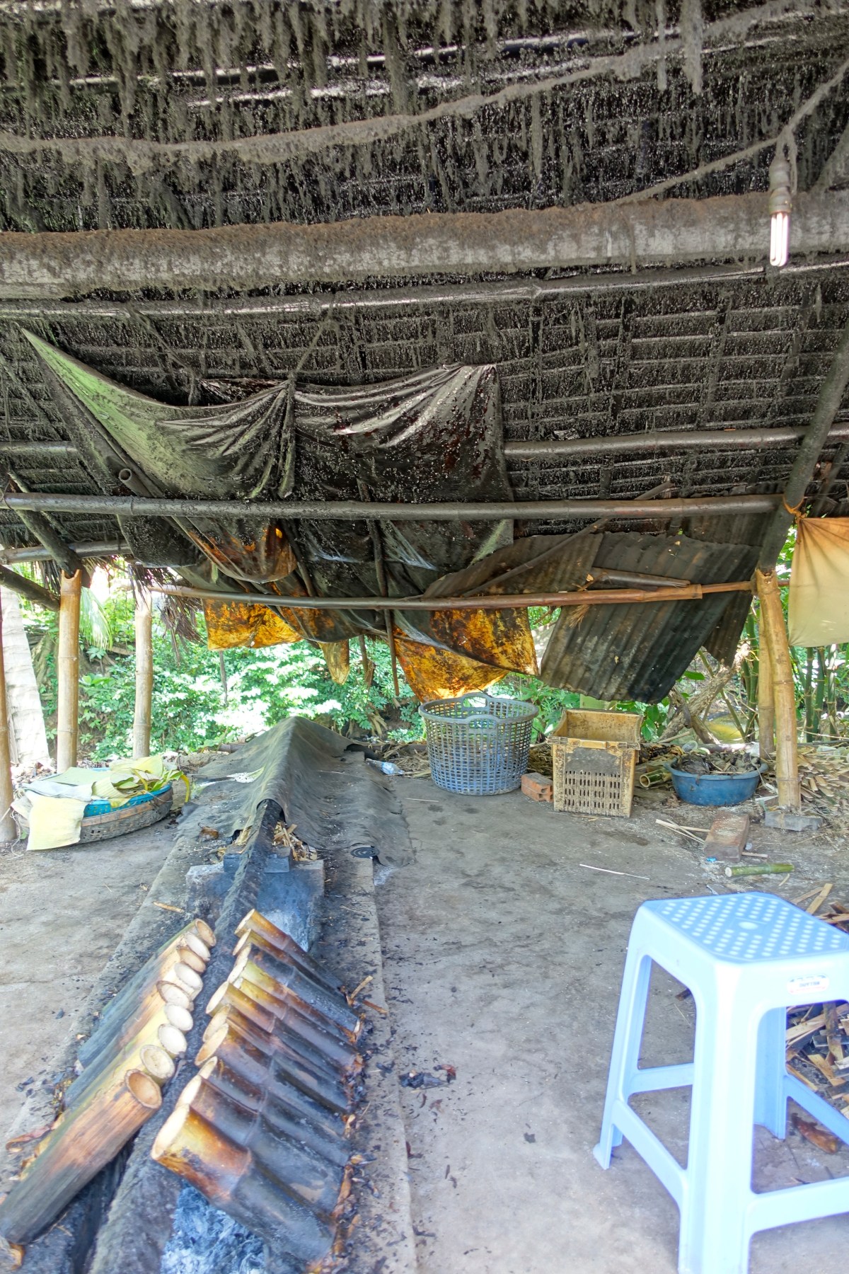 Wir kriegen nicht nur eine 1A Geschichtsstunde, sondern bekommen auch Einblicke in die traditionelle Herstellung von Reispapier, Reisschnaps, Bananenchips und dem traditionellen Bamboo-Klebreis. Wir probieren alles, obwohl die Produktionsbedingungen nicht ganz den europäischen Standards entsprechen – oder überhaupt irgendwelchen Standards.