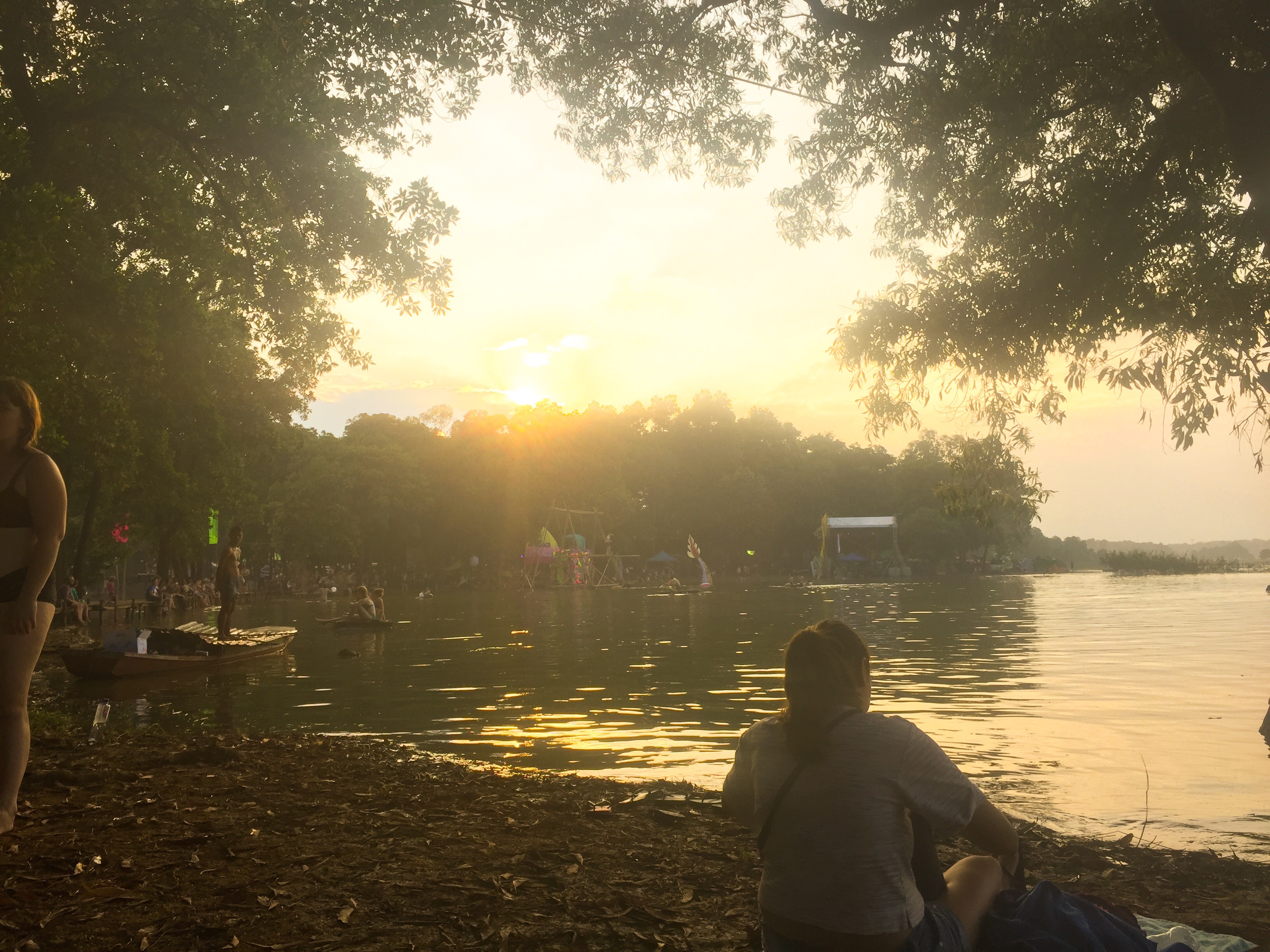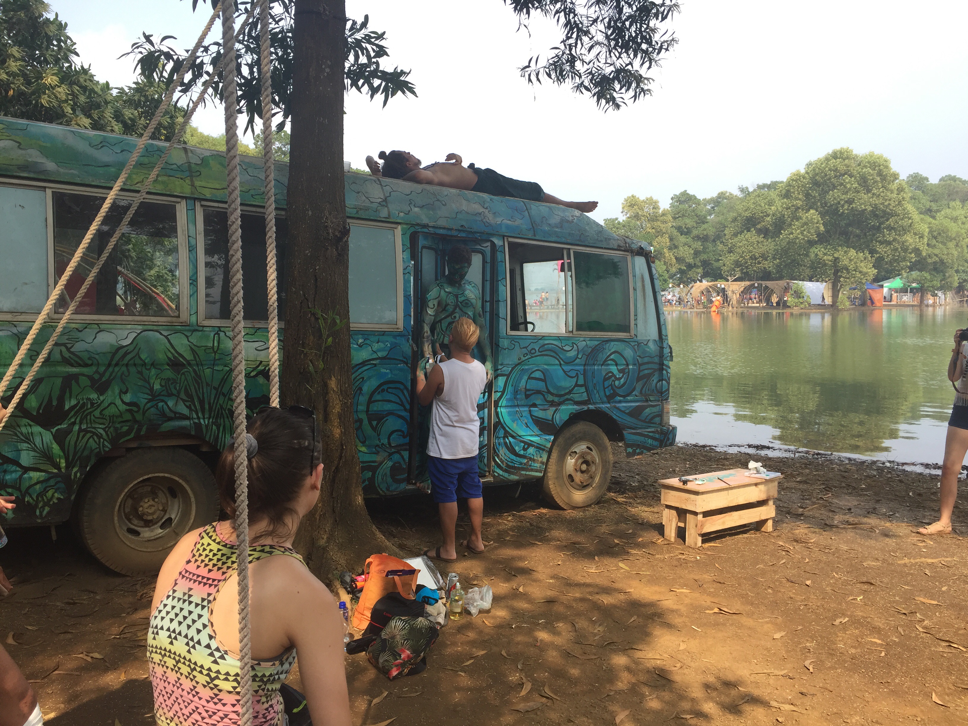 Auch ohne Drogen lässt sich die Stimmung an diesem Ort jedoch wunderbar aufsaugen. Es ist ein bisschen wie Urlaub vom Urlaub. Man streift über das Gelände, geht zur Impro-Comedy, schwimmt eine Runde im See oder döst ein paar Stunden in einer der zahlreichen Hängematten. Ich treffe die K. wieder, mit der ich ein wenig Zeit verbringe und endlich mal wieder deutsch reden kann. Alles ist untermalt von den Bässen, die 72 Stunden lang nonstop an den Fäden der Marionetten mit den kleinen Pupillen ziehen.