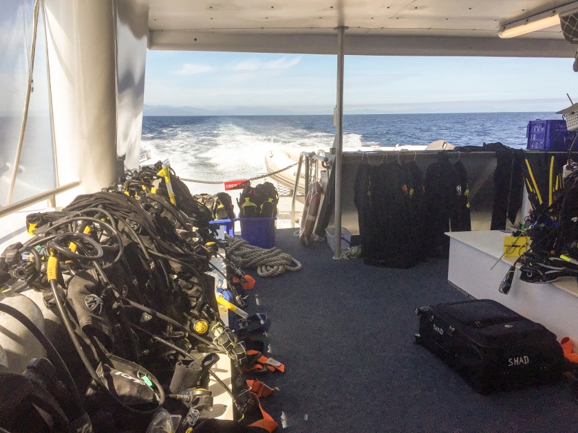 Was sich dann auftut, ist mit Worten nicht zu beschreiben. Die Höhle ist riesig und durch das Loch an der Decke fallen die Sonnenstrahlen ein. In 15 Metern tiefe, wo die sogenannte Sprungschicht (Halocline) das Salz- vom Süßwasser trennt, bricht sich das Licht in einem magischen Flirren. In ca. 30 Metern tiefe tut sich ein Geisterwald auf. Die toten schwarzen Bäume, die beim Einsturz der Höhlendecke hier runter gefallen sind, werden von Bakterien zersetzt, die eine dichte weiße Wolkendecke aus Schwefelwasserstoff inmitten die Höhle gezogen haben.